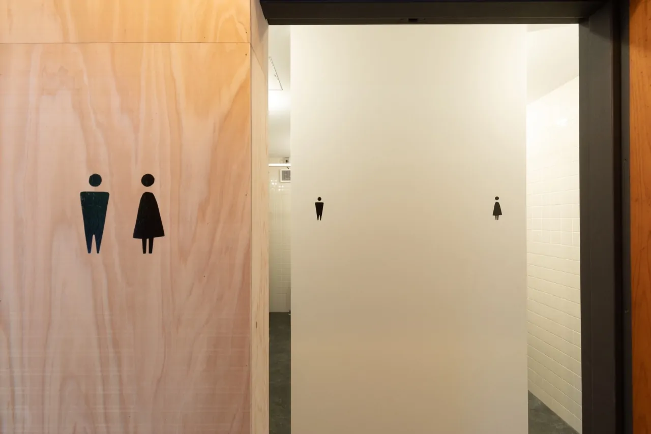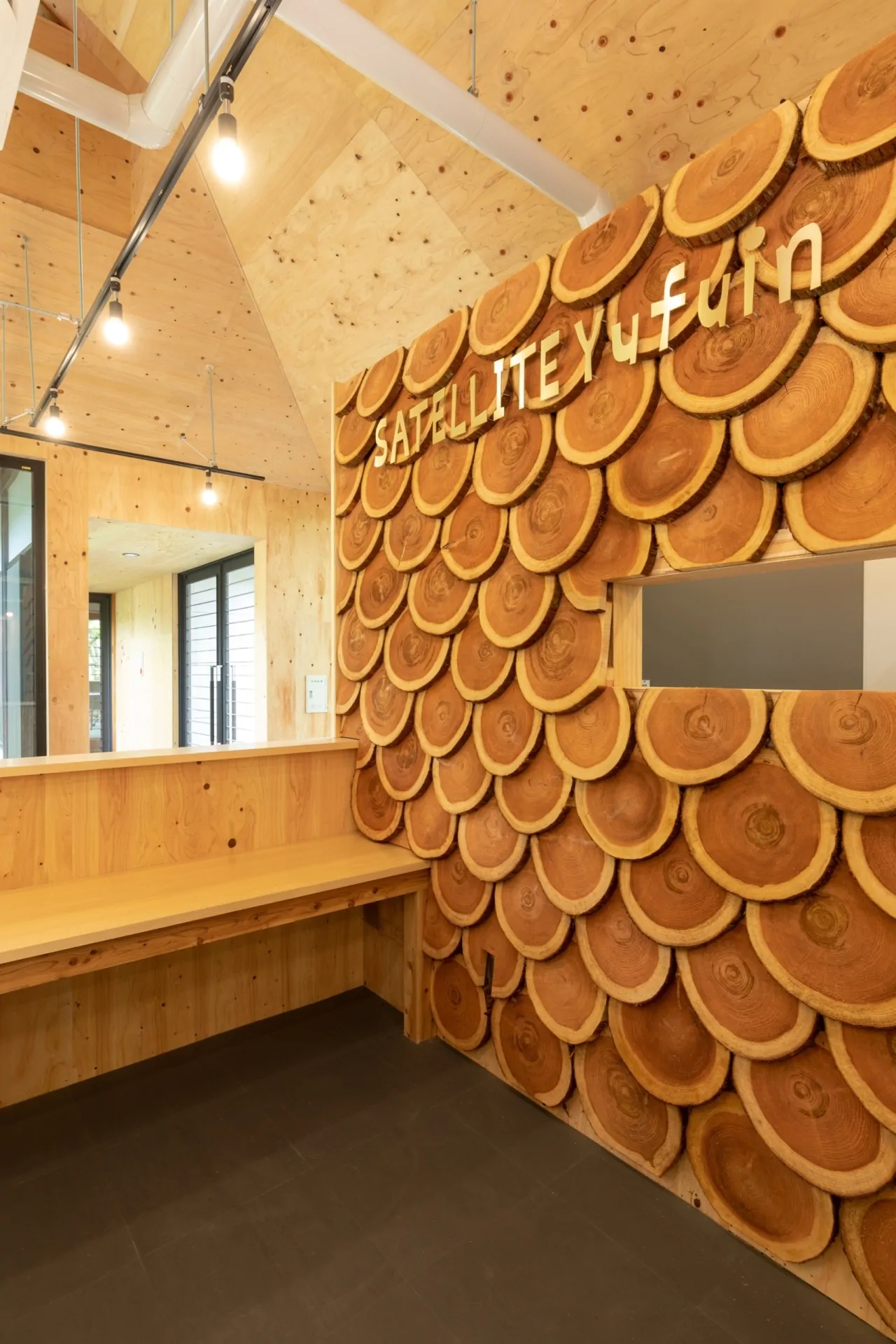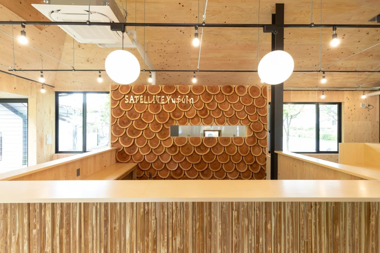 内装には、九州産材および由布市内産のスギ材を主材として用いた。空間に木質面を広く展開し、開口部から入る自然光とともに、空間全体がやわらかな空気に包まれるような構成としている。エントランスカウンター背面の壁面には、丸太をスライスしたパネルを用い、金鱗湖に棲むとされる龍の鱗をイメージした造形を取り入れた。素材の記憶が、土地の物語性を静かに喚起する。