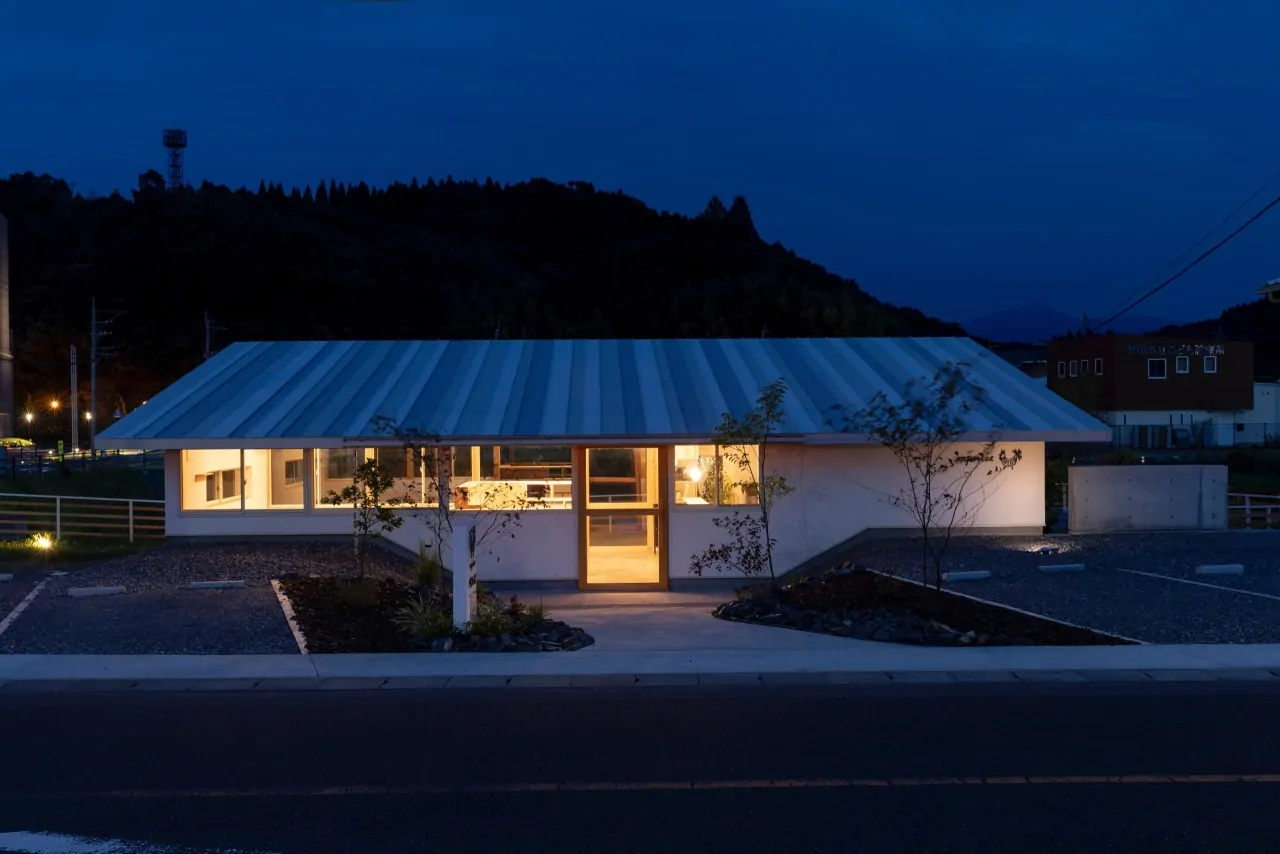 片流れの一枚屋根が特徴的な新築木造1階建の小さなカフェ。竹田市玉来の児童公園「竹の子ひろば」の川を跨いですぐ向かいの緩傾斜地に佇んでいます。子供たちが遊ぶ様子を眺めながら、親御さんたちが一息つける場所となるよう、川と公園との繋がりを意識した設計としています。小路を下り高さを抑えた軒を潜るアプローチから店内に入ると、公園側へパッと景色が開く開口を設け、落ち着きと開放感を両立できるよう工夫しました。