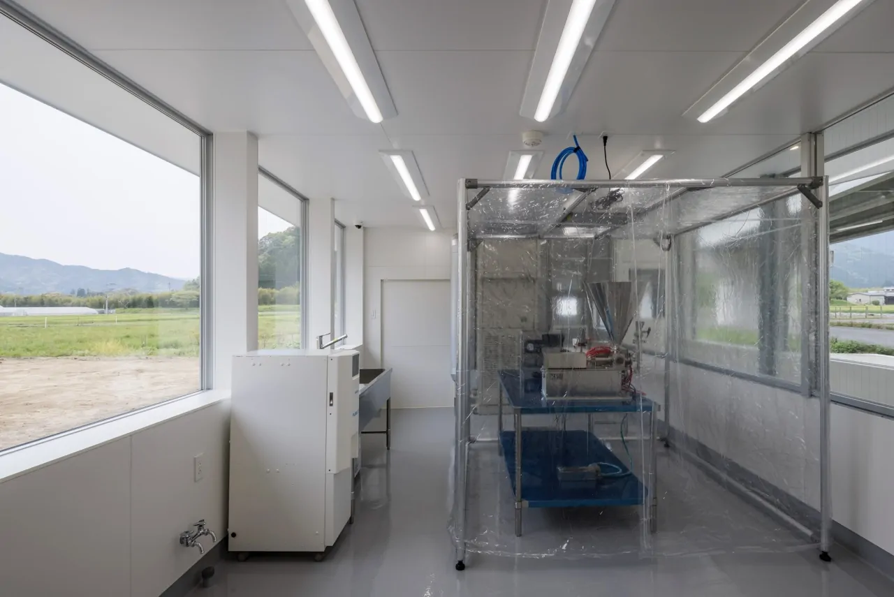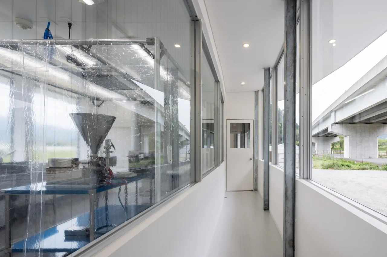 今回施設を設計するにあたり、単純な門型フレームの小さな変化の積み重ねによって柔らかい形を獲得し、機能的でありながらも抑揚のある特徴的な空間の実現を目指しました。曲面屋根は各室の用途に適した天井の高さを緩やかに繋げており、平面的な湾曲は、隣接する麦畑と建物の間に余白を生み出しています。工程を可視化したクリーンルームを中心に据えた機能的なレイアウトとし、内部動線は見学通路にもなるようにしました。それらが外部からも見えるようにする事で、地域の人々が汚染や公害の不安を感じず、安心でき、親しみを感じて気軽に立ち寄れる工場となるよう計画しました。