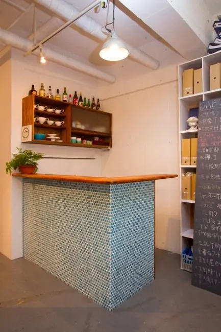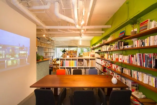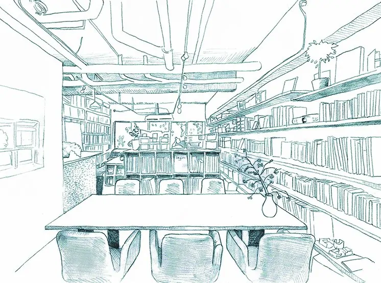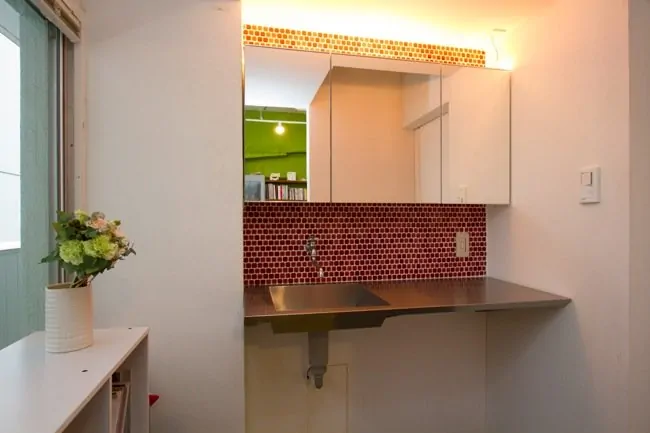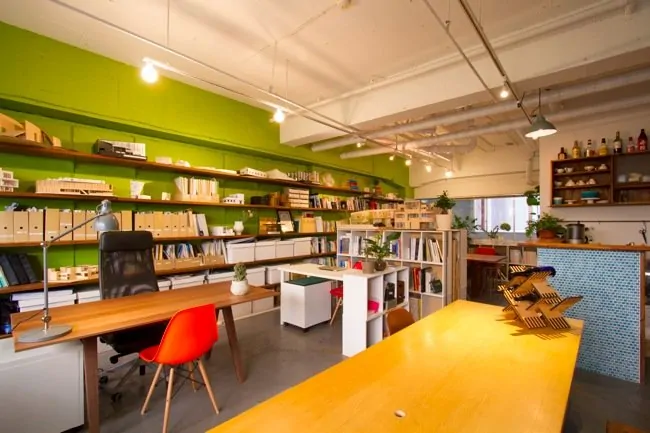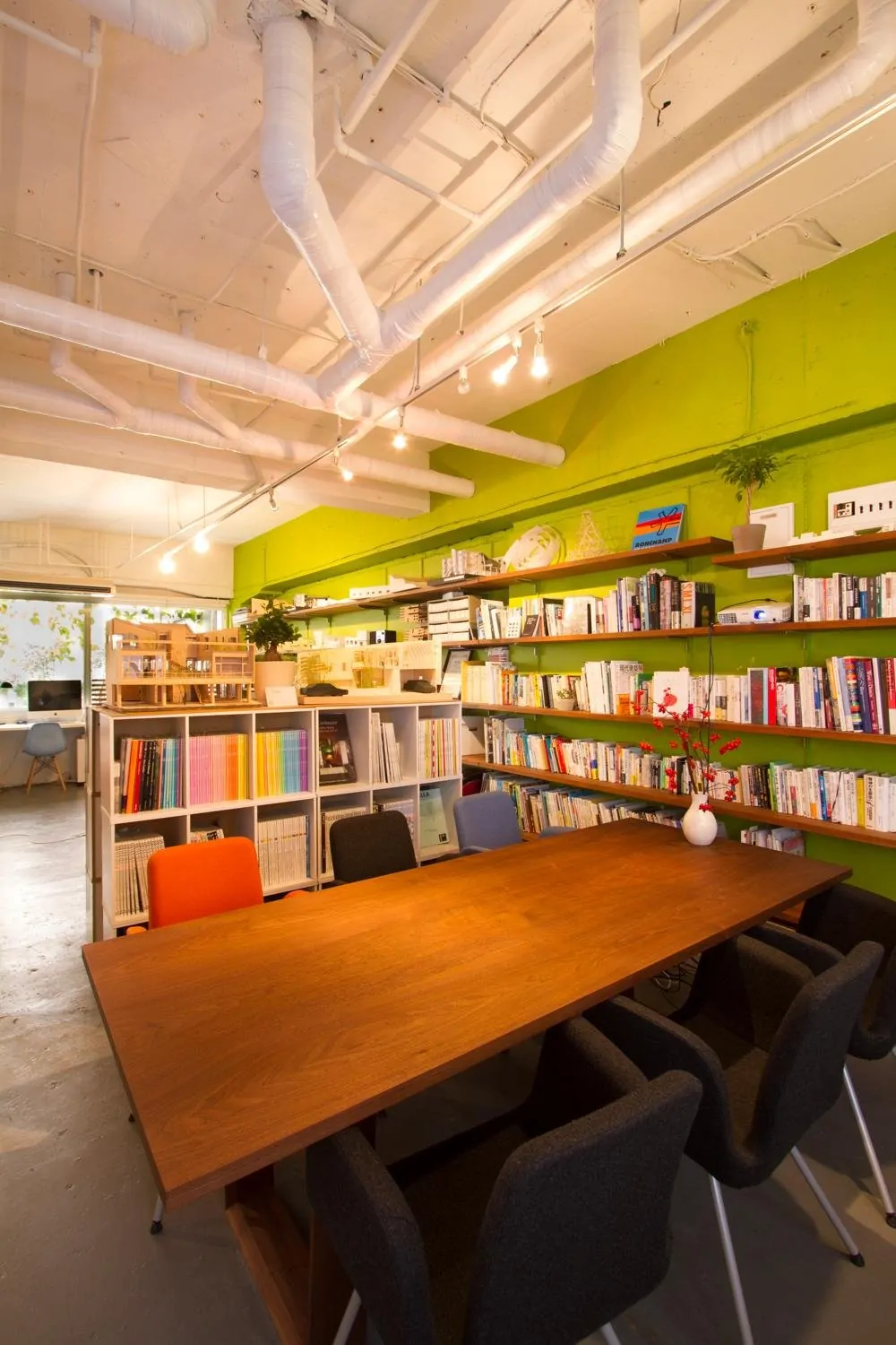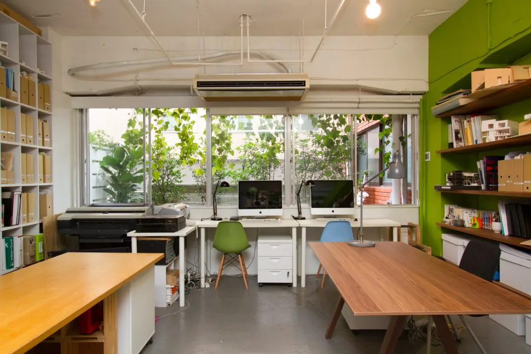 大分市府内町にある、当社のオフィス。タイトな間口。奥行きのある空間。窓の外に垂れ下がる蔦の葉の緑は、オーナーが育てているビルの備品でそれが気に入り入居。建築は長丁場の仕事。元気や安らぎがほしくて、本棚のバックの壁面は明るい緑に塗装した。給湯コーナ-は、ちょっと一息つきながらアイディアを出し合うスタンドバーとして。ミーティングテーブルは東京で家具をデザインしている友人のANP INTERIOR DESIGN小早川梓さんにお願いした無垢のウォルナット材によるもの。